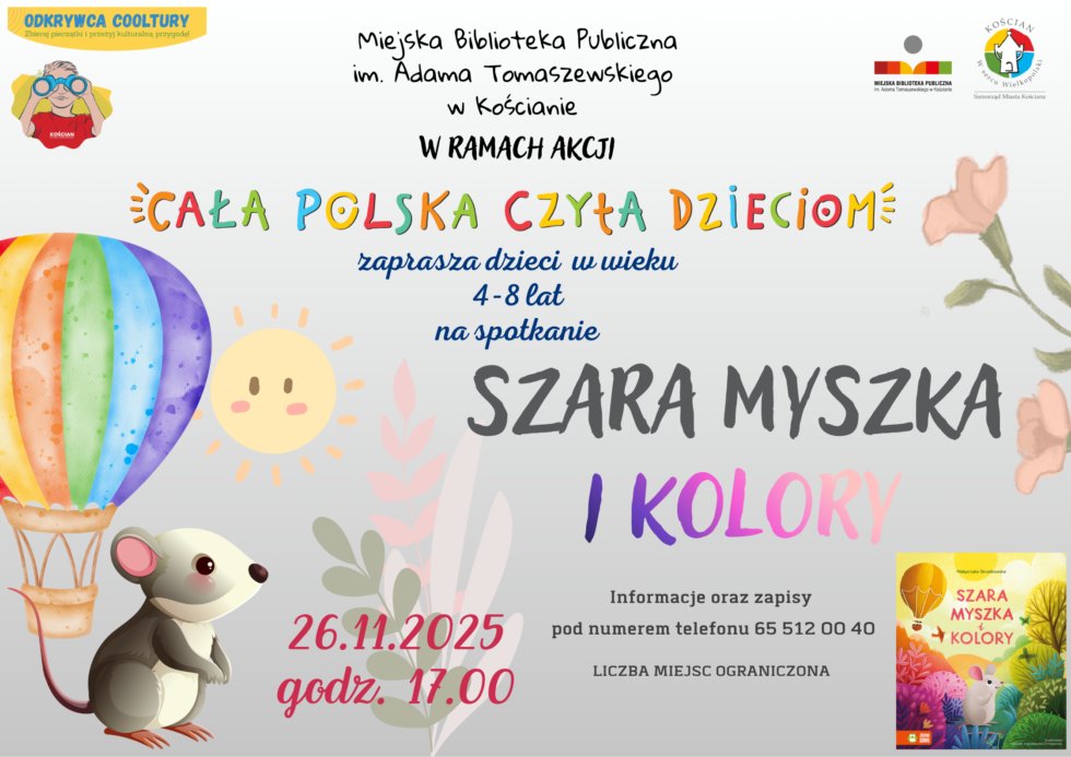 Zapraszamy serdecznie na comiesięczne spotkanie w ramach akcji Cała Polska Czyta Dzieciom, tym razem zainspirowane książką Małgorzaty Strzałkowskiej „Szara myszka i kolory”.