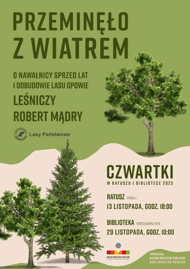 Zapraszamy na spotkanie z cyklu „Czwartki w ratuszu i bibliotece” zatytułowane „Przeminęło z wiatrem”. O nawałnicy sprzed lat i odbudowie lasu opowie leśniczy Robert Mądry.