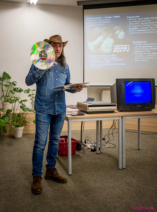 Prowadzący spotkanie: Paweł Sałacki i Roman Kosicki prezentują klasyczny winyl z albumem Thriller i płytę gramowidową z teledyskiem i filmem dokumentalnym.