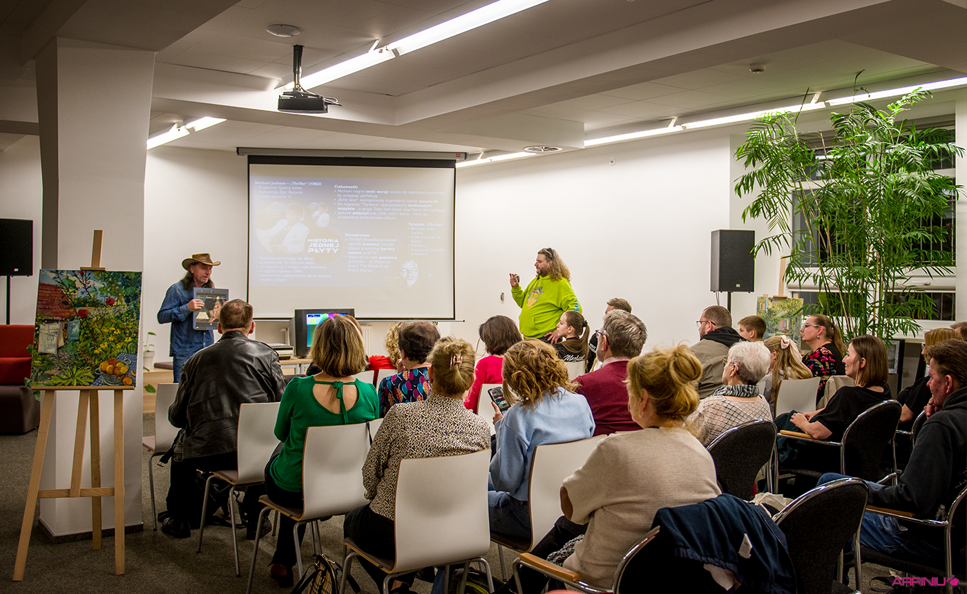 W halowinowy wieczór, w naszej bibliotece odbyło się kolejne spotkanie z cyklu „Historia jednej płyty”, którego bohaterką była tym razem legendarna płyta „Thriller” Michaela Jacksona - najlepiej sprzedający się album w historii fonografii, uznawany za przełomowe dzieło muzyki pop.