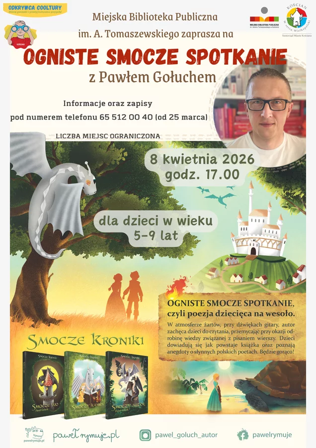 Poeta będzie naszym gościem 8 kwietnia. Zapraszamy dzieci w wieku od 5 do 9 lat. Obowiązują zapisy, których dokonywać można osobiście w Oddziale dla Dzieci lub telefonicznie pod numerem 65 512 00 40. Po spotkaniu istnieje możliwość zakupienia książek z imienną dedykacją i autografem autora, oraz ręcznie szytych przez niego poduszek w kształcie smoczej głowy.
